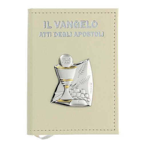 Taufevangelium aus Kunstleder mit Etui und einer Silber-Laminat-Plakette. Die Plakette stellt den traditionellen Kelch dar.