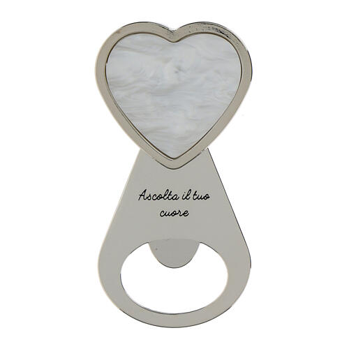Hergestellt aus Kunstperle und Stahl. Der Flaschenöffner trägt die Gravur ''Höre auf dein Herz'' auf der Öffnungsseite.