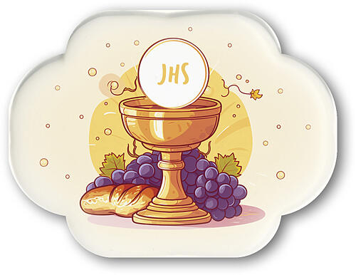 Dieses kleine dekorative Objekt in Form einer Wölkchen ist aus mattem Porzellanharz gefertigt. Es zeigt einen Kelch mit in der Mitte einer Hostie, auf der die Buchstaben JHS eingraviert sind, Trauben und Brot - alle Symbole der Erstkommunion.