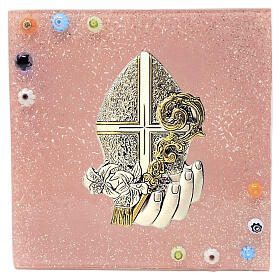 Bildchen mit Mitra, Bibel und Hirtenstab aus rosa Holz, 8 cm