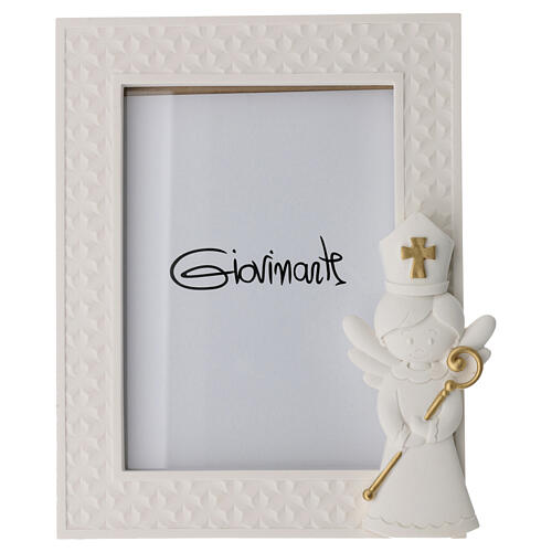 Bilderrahmen im Hochformat mit Aufsteller, gefertigt in Italien. Der weiße Rahmen mit geometrischer Gestaltung ist mit einem Engel verziert, der bischöfliche Symbole trägt, und eignet sich daher ideal als Geschenk zur Firmung.