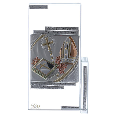 Kristall Bild Symbole der Firmung Platte 15x10cm. Bild realisiert aus Kristall und verfeinert mit den Firmung Symbolen auf Silber Platte.