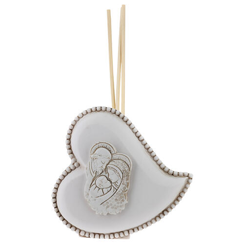 Duftdiffusor aus Carrara-Marmor in Herzform mit erhabener Darstellung der Heiligen Familie.
