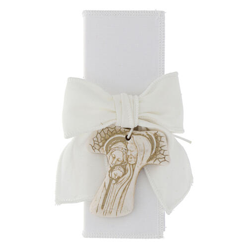 Darstellung der Heiligen Familie, ideal für Hochzeit oder Taufe, mit Schleife und Kreuz.