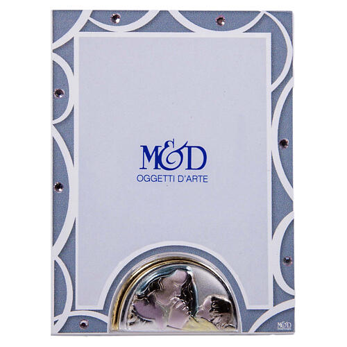 Dieser Bilderrahmen aus Glas mit blauem Rand ist ein stilvolles Geschenk zur Taufe. In Italien handwerklich gefertigt, ist er mit kleinen Schmuckkristallen verziert und trägt unten ein Reliefbild mit Silberbeschichtung und farbigen Akzenten, das die Mutterschaft darstellt. Die exakten Maße betragen 9,5 cm in der Höhe und 7,5 cm in der Breite.