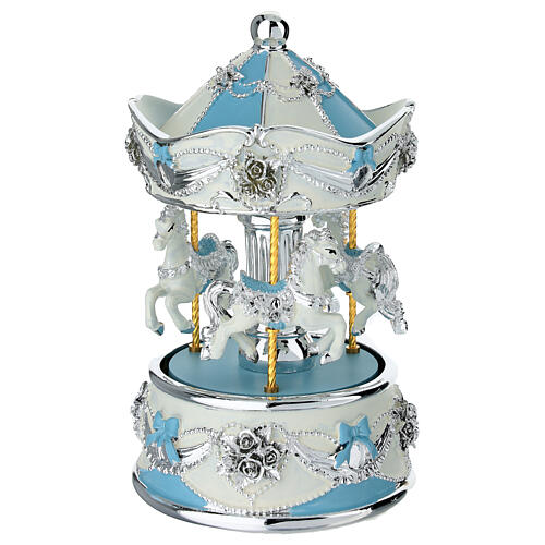 Spieluhr-Karussell mit drei weißen Pferden, verziert mit silbernen Mähnen und blauen Sätteln. Die Spieluhr ist in zarten Blautönen dekoriert, mit raffinierten Details in Silber und Weiß, die einen romantischen und zeitlosen Touch verleihen.