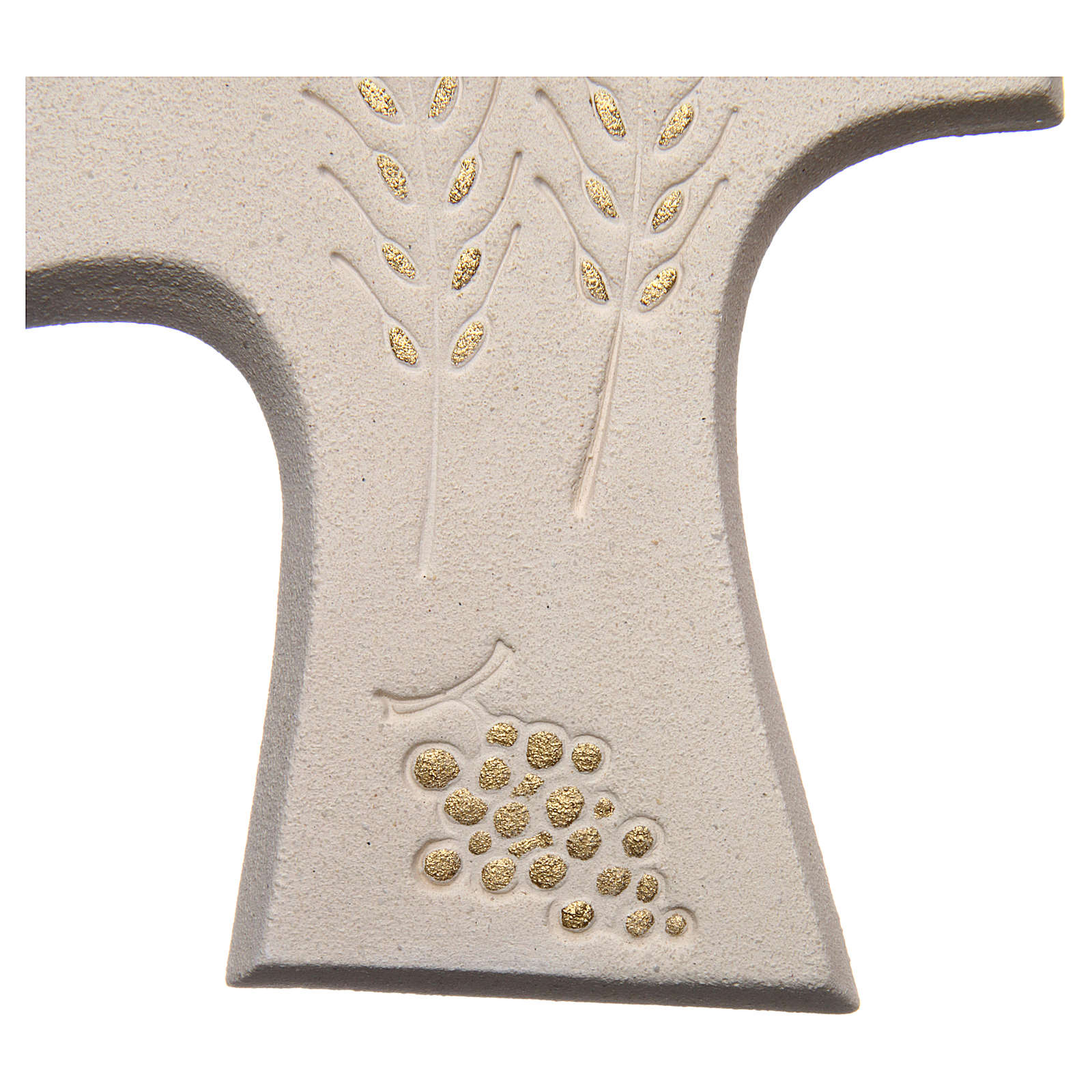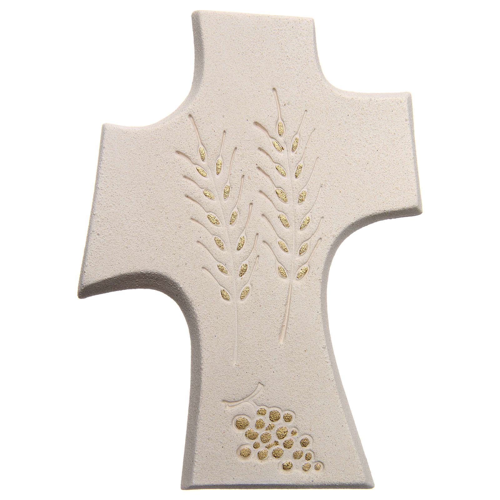 Kreuz Erste Kommunion aus Schamotteton, handgemacht, mit Darstellung von Ähren und Trauben.
