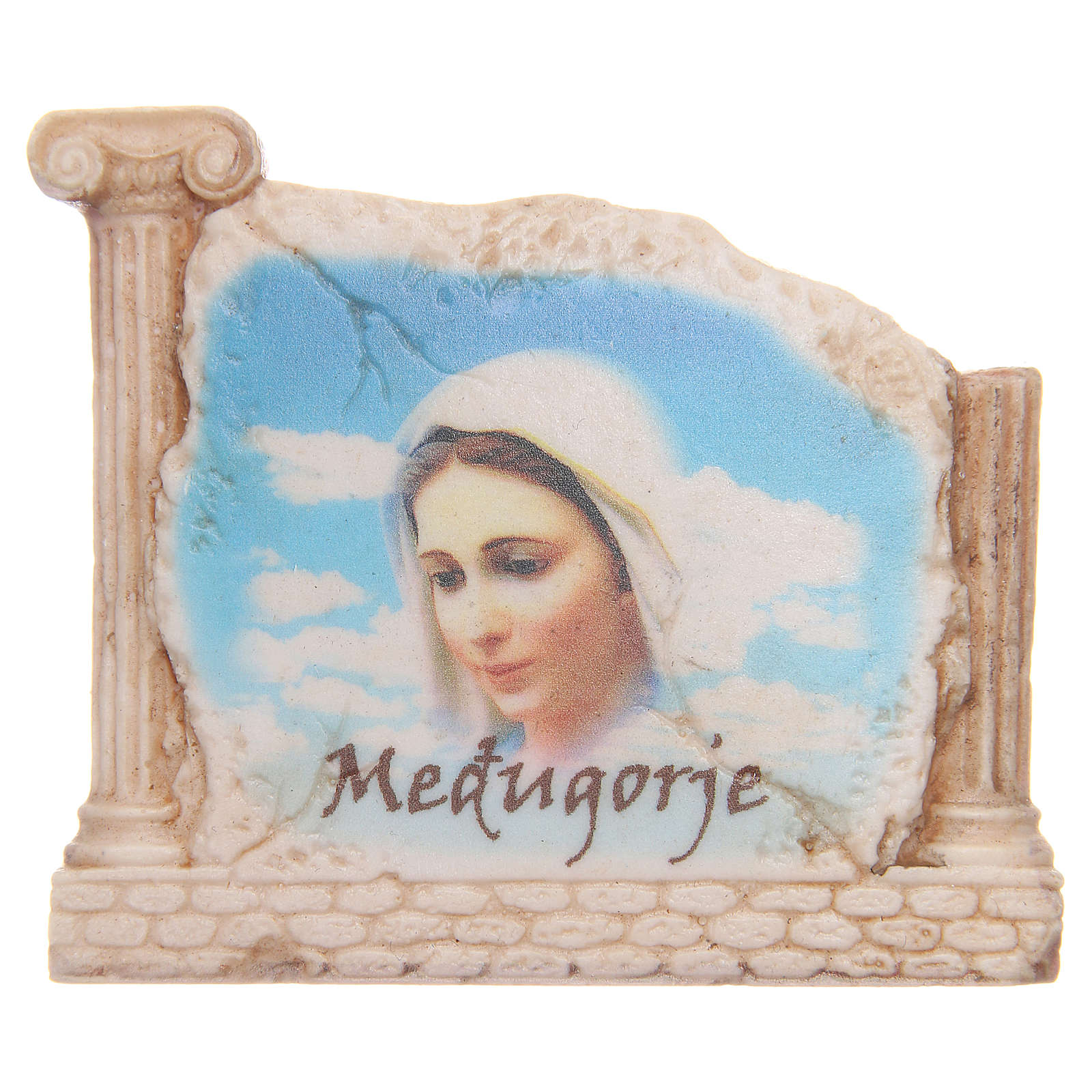 Magnet Gesicht Gottesmutter von Medjugorje. Magnet realisiert aus Stein mid Bild der Gottesmutter von Medjugorje.