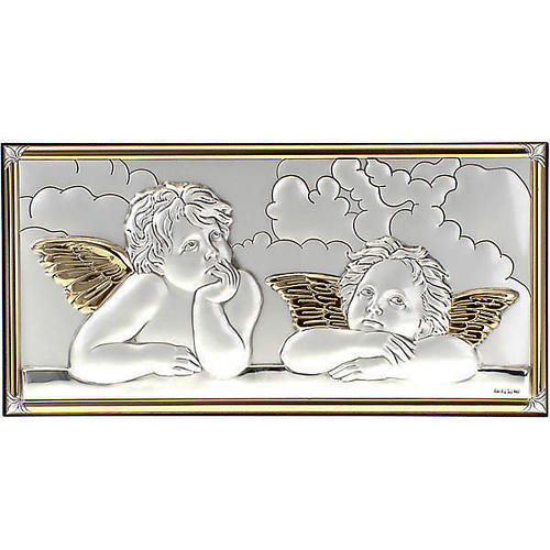 Rechtwinklieges Bassrelief aus Silber und Gold dass die Engeln von Raffaello auf den Wolken zeigt. Wegen die besondere Bearbeitung, ist es rostfrei. Die Oberflaeche ist glaenzend und satiniert. Man kann es haengen. Es ist garantiert(Zeugnis) und ist in der originalen Scachtel. Um es zu sehen, klicken Sie hier.