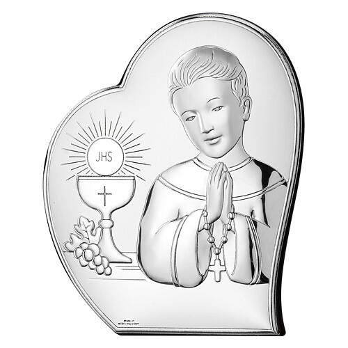 Reliefbild mit Silberbeschichtung – Erstkommunion Junge, Herzform 14,5 × 12 cm, Valenti