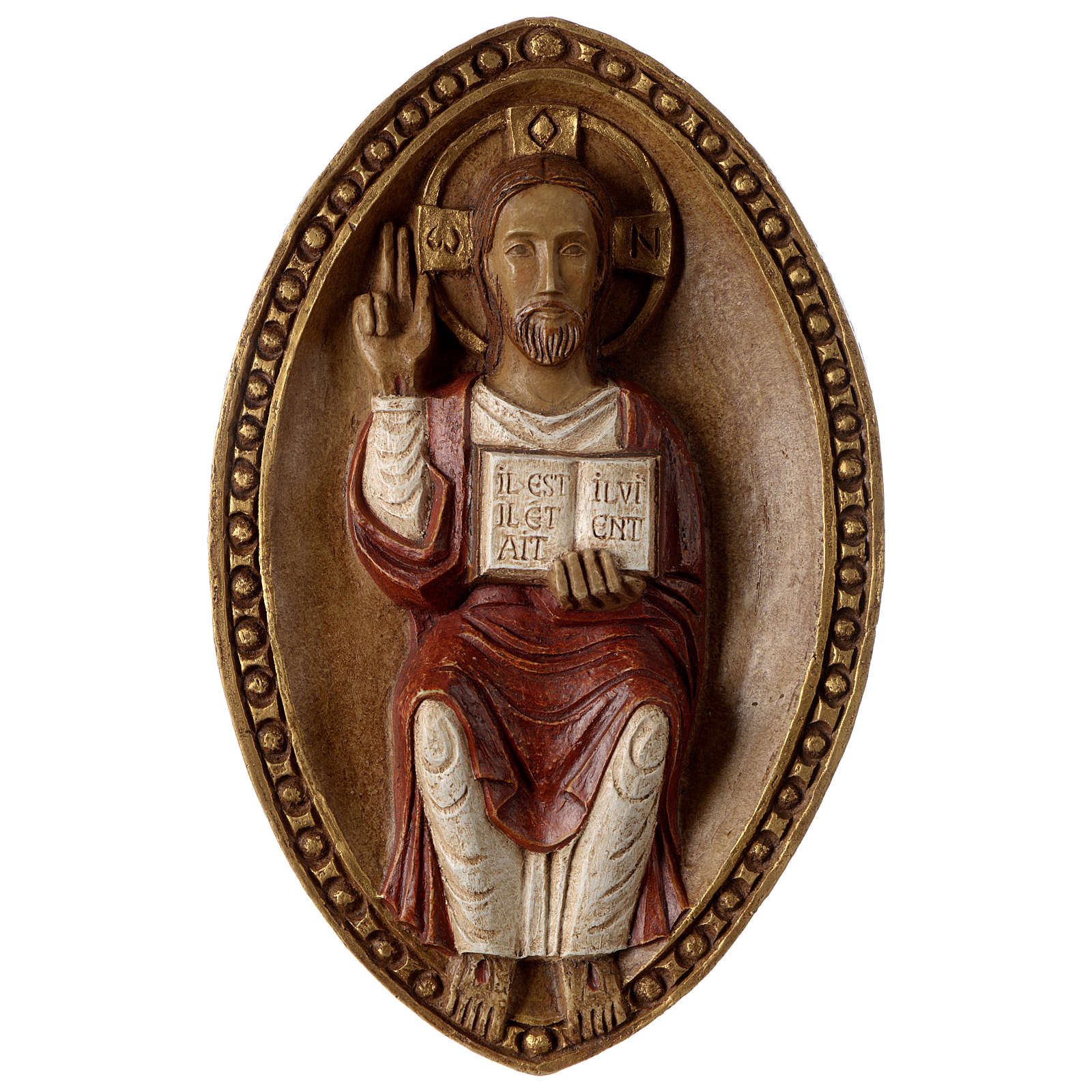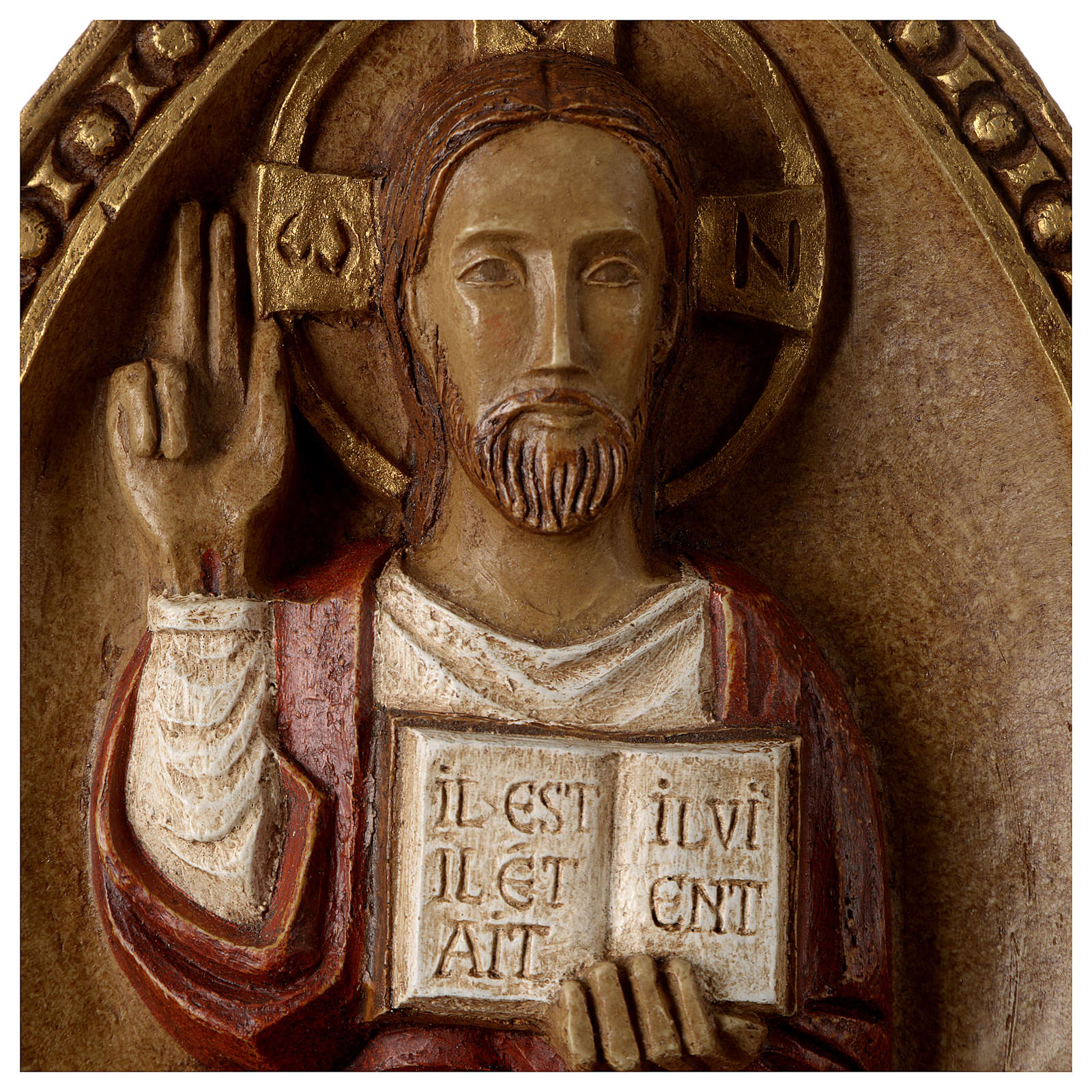 Flachrelief Jesus in seiner Herrlichkeit, der die Menschen aufruft sich auf ihn, "dem Lebenden", zu verlassen und auf ihn zu vertrauen. Dieses ausdrucksstarke Bild des Christus, der die Menschheit zu sich ruft, wurde aus pyrenäischem Stein gefertigt.
