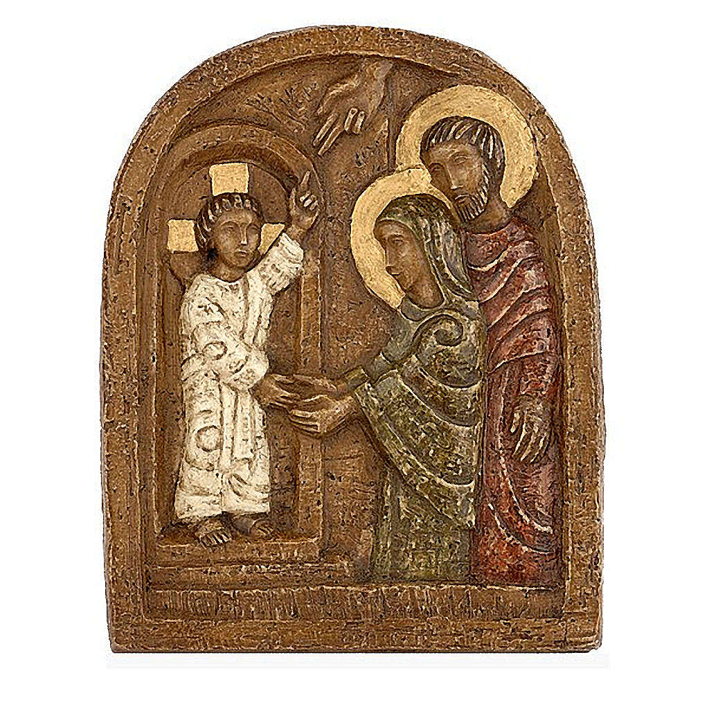 Dieses Flachrelief stellt die Wiederfindung Jesu im Tempel dar. Maria und Josef erahnen erstmals das Geheimnis, das den irdischen Weg Jesu umhüllt. Handgefertigt von den Schwestern des Klosters San Bruno von Bethlehem.
