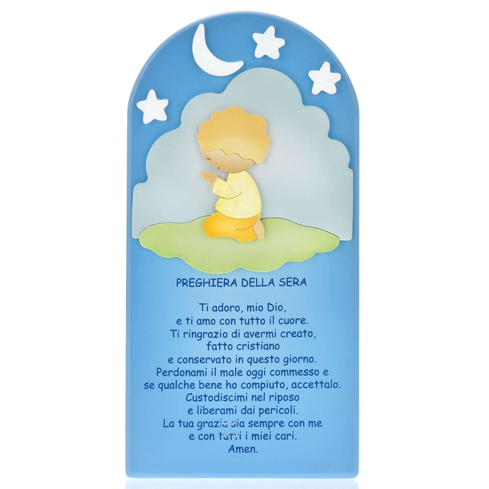 Die Basrelief-Tafel ist aus Holz und stellt ein Kind im Gebet auf blauem Hintergrund dar, mit dem Abendgebet auf Italienisch ('Preghiera della Sera').