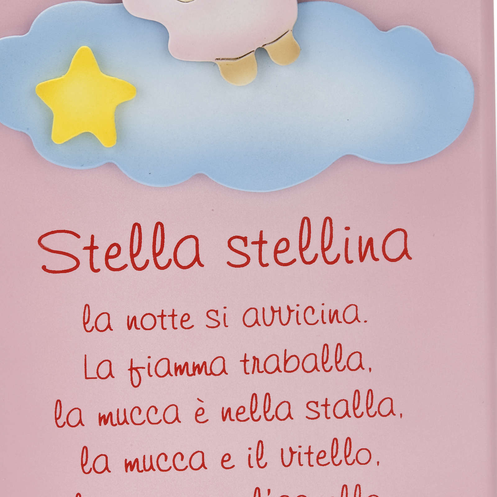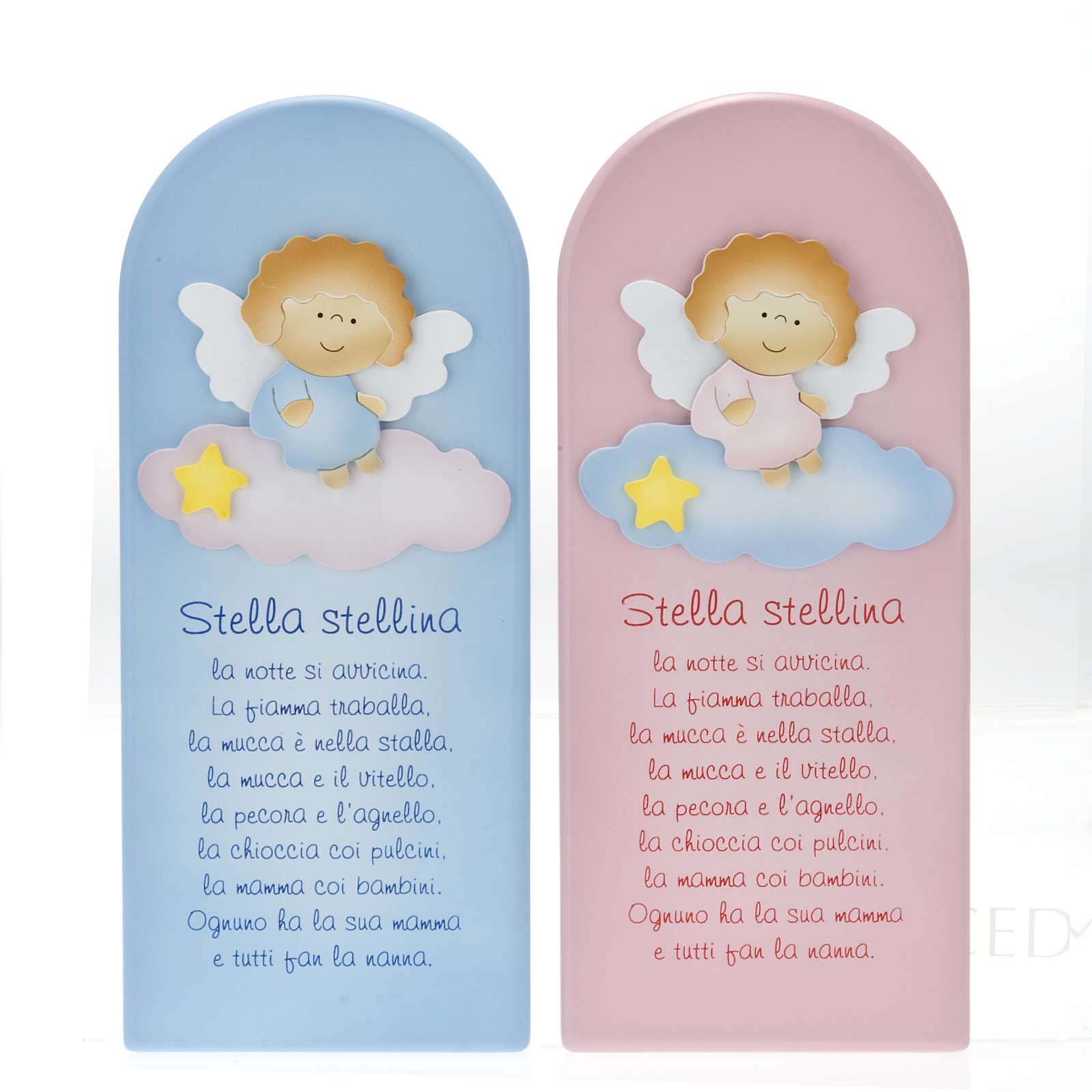 Das Basrelief ist aus Holz, mit Engel auf Wolke und dem italienischen Wiegenlied "Stella Stellina" ("Stern-Sternchen").
