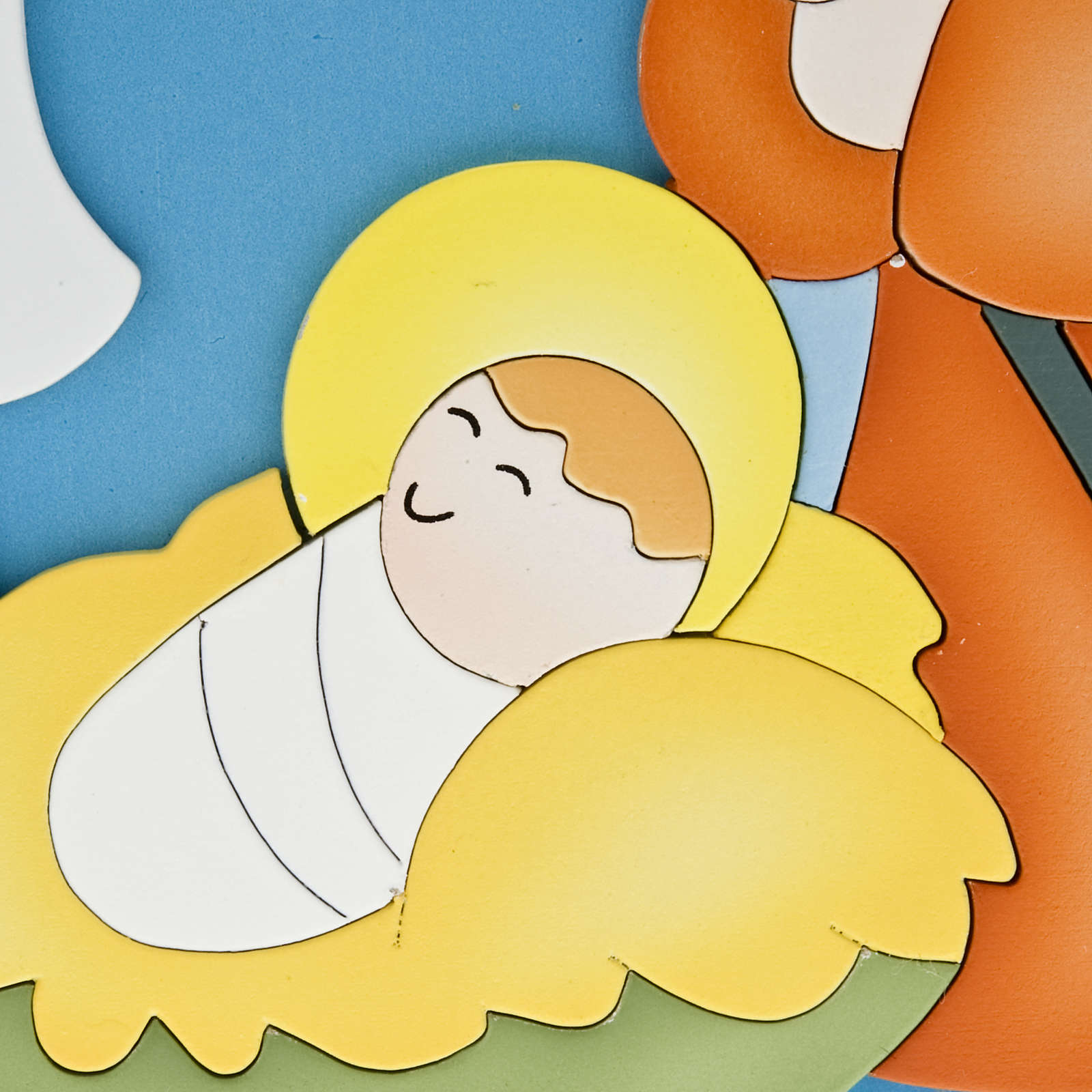 Die Tafel ist aus Holz, in blauem Hintergrund und stellt die Geburt dar.