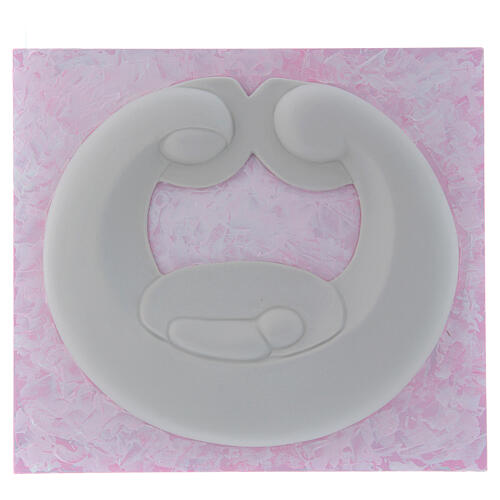 Flachrelief Pinton Heilige Familie weißes Porzellan auf rosa Paneel 22x25 cm