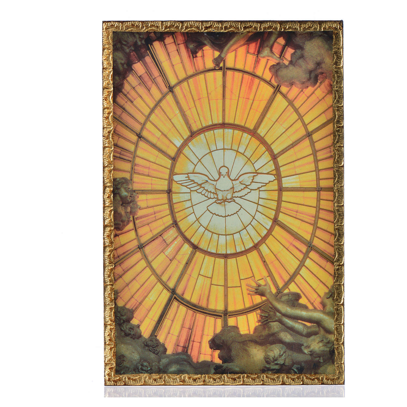 Druckbild auf Holz mit dem Heiligen Geist, und mit beleuchtetem Glasfenster im Hintergrund.