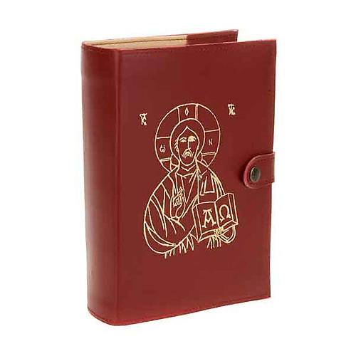 Deckel fuer "Bibel - Weg, Wahrheit, Leben neue Ausgabe Heilig Paul(seit 2009)" aus echten Leder Bordeaux mit dem Bild des Kristus Pantocratore. Das Leder ist weich und ziemlich glaenzend. Drin ist die Stoffe Beige.