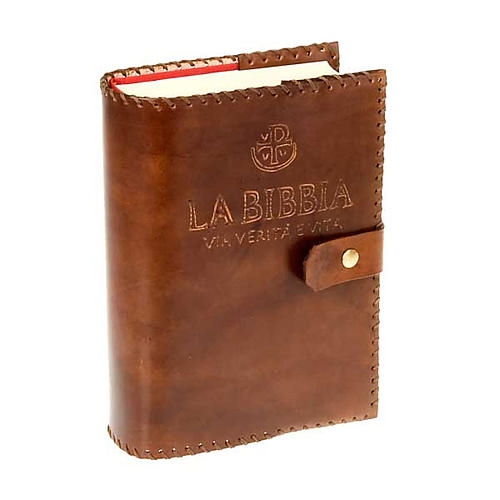 Deckel fuer Bibel aus echten Leder, handgemacht. Man schliesst mit Knopf aus vergoldeten Metall. Es passt besonders zu den Pfadfindern. Es zeigt den Schrift"Weg, Wahrheit, Leben". Es wird bei der Genossenschaft "Cooperativa Sociale L'Arcobaleno" produziert, wo Behinderten Leuten beschaeftigt sind.