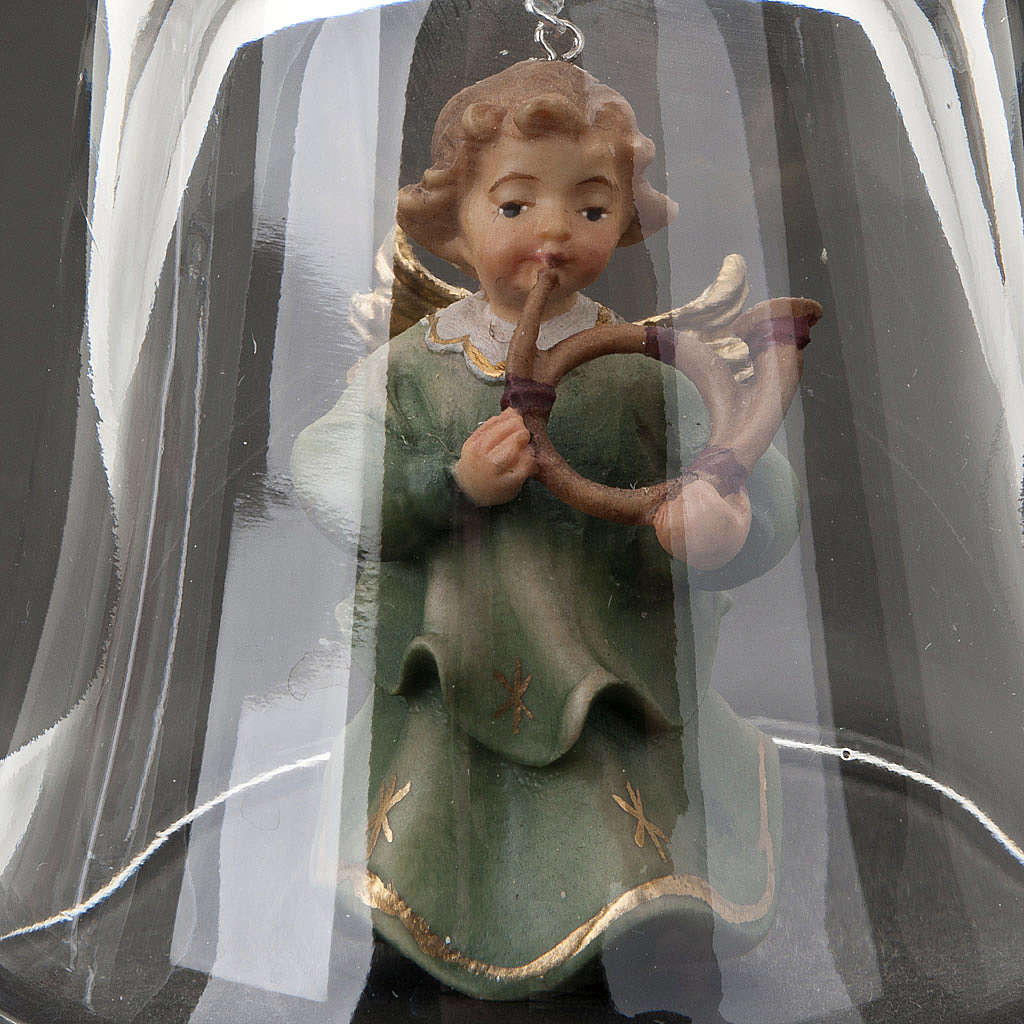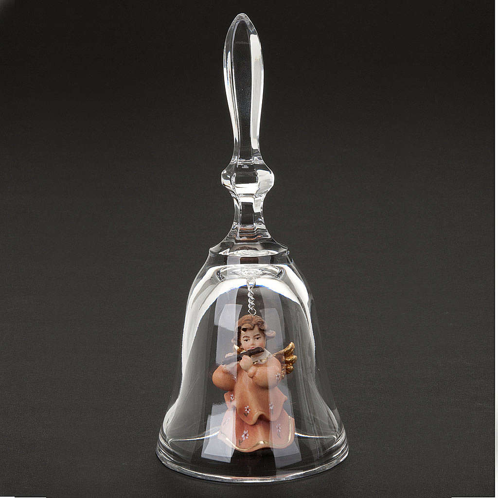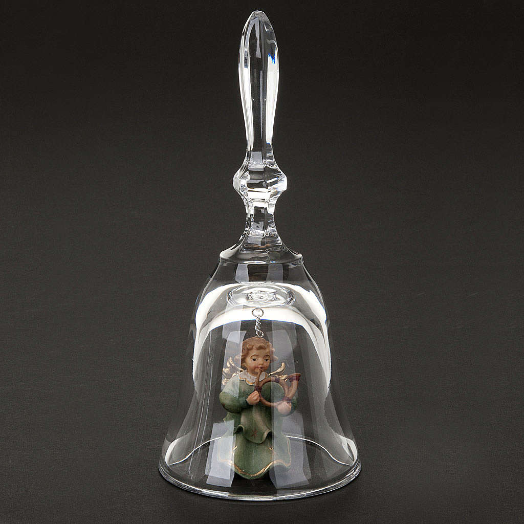 Glocke aus Kristall mit einem Kloeppel aus Holz der Engel-Foermig ist. Es ist handgeschnitzt und mit Oel-Farben handgemalt. Es its circa 5 Zentimeter hoch. Es kann ein einzig Geschenk und eine zarte Dekoration fuer das Haus sein. Der Engel kann Rosa oder Gruen gekleidet werden; man kann unten dem Bild die Farbe waehlen.