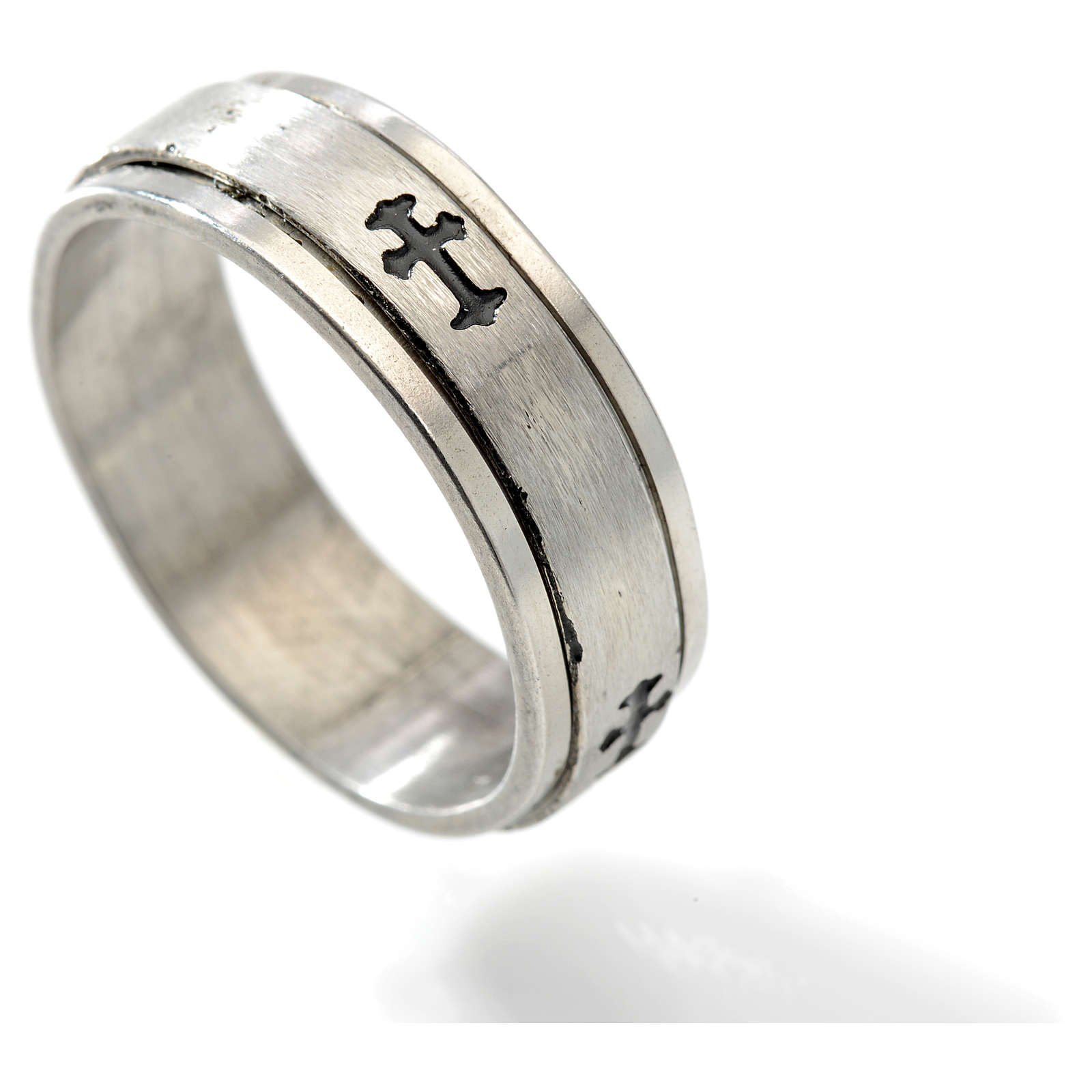 Drehring aus Edelstahl mit 4 Kreuze darauf eingepraegt. Es ist undurchsichtig; die Kreuze sind schwarz. Das mittlere Teil dreht.