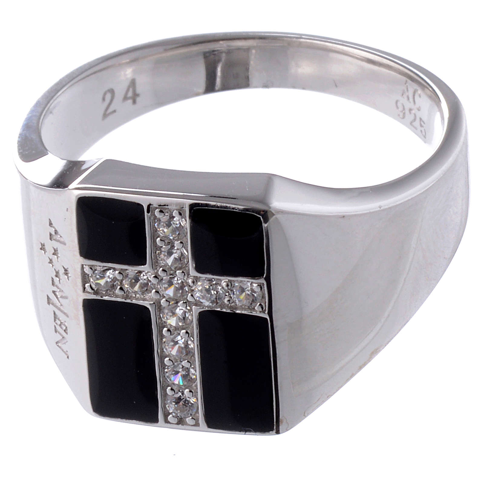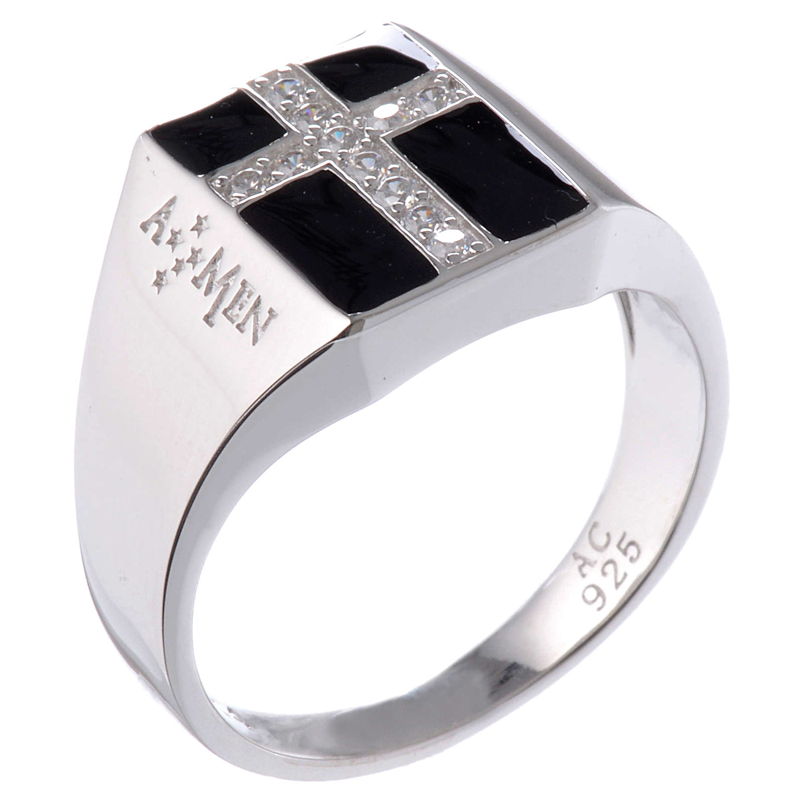 Ring AMEN Mod. Chevalier Silber 925 und Emaillack. Ring AMEN realisiert aus rodinierten Silber 925 und verfeinert mit Zirkonen und schwarzen Emaillack.