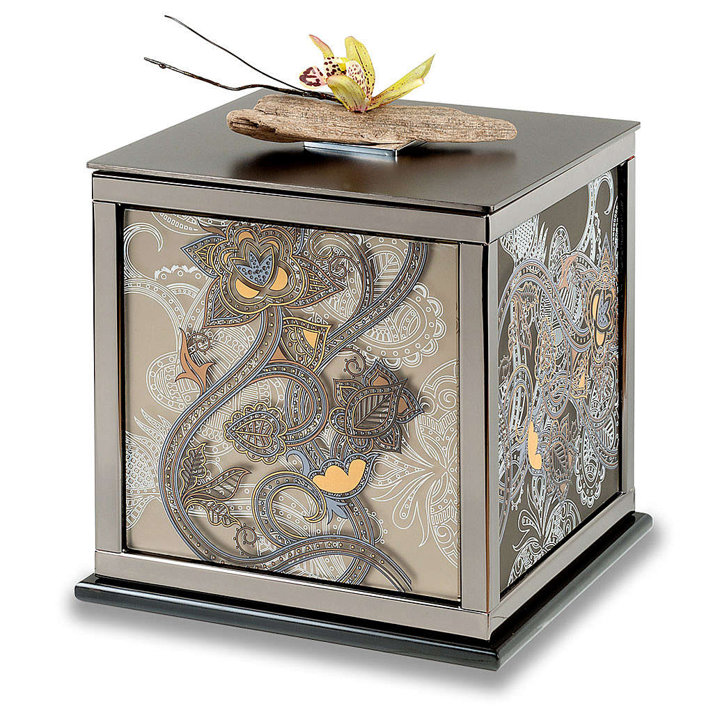 Aschenurne Jim M. Aschenurne realisiert aus Metall mit Black Titanium Finish, und der Deckel ist mattiert. Die vier Seiten sind aus bronzefarbigen Glas realisiert, und ist mit einem Art Déco Druck dekoriert.