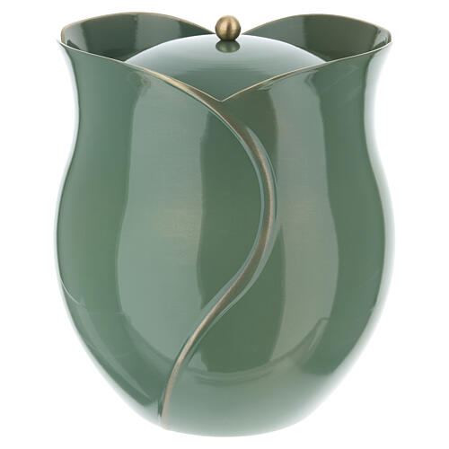 Aschenurne in Blütenform zur Aufbewahrung der Asche, gefertigt aus technischem Material mit wassergrüner Oberfläche und einem Fassungsvermögen von 4 l.