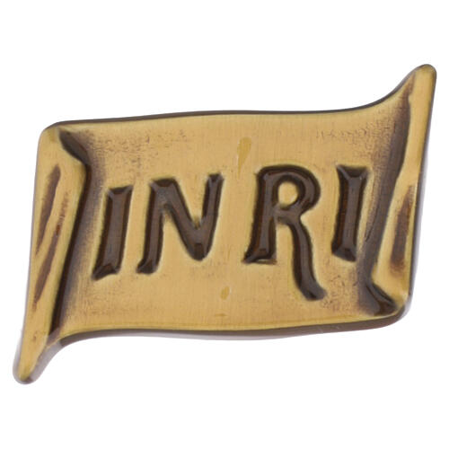 INRI-Tafel für Kruzifixe und Christusfiguren, mit den Maßen 3 x 4,5 cm. Die bronzefarbene Ausführung trägt eine eingravierte Inschrift.