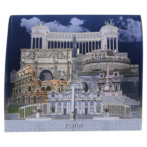 Farbige Weihnachtskarte, die sich beim Öffnen in eine dreidimensionale Pop-up-Papierskulptur mit den bekanntesten Monumenten der Stadt Rom verwandelt.
