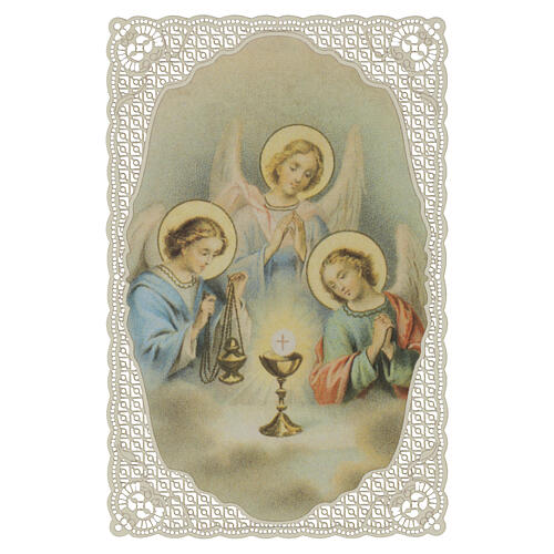 Spitzenbildchen aus Baumwollfaserpapier mit Darstellung von drei Engeln in andächtiger Haltung um einen Kelch mit konsekrierter Hostie als zentrales Symbol der Eucharistie.