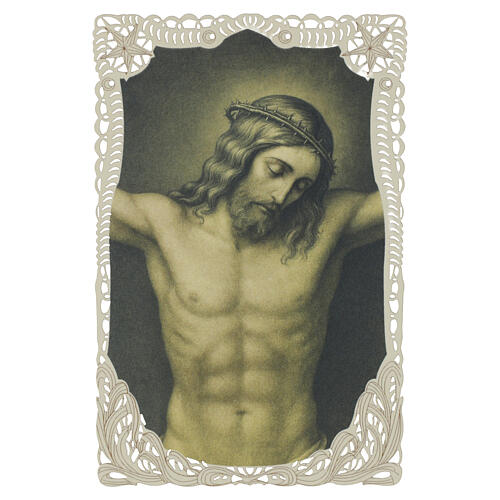 Spitzenbildchen aus Baumwollfaserpapier mit Darstellung des gekreuzigten Christus im Moment der Passion, mit gesenktem Blick und Dornenkrone.