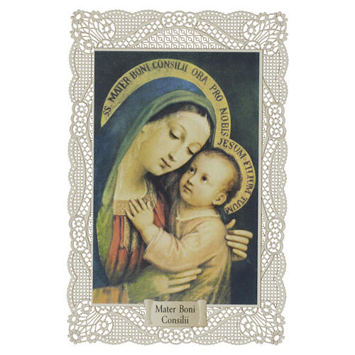 Spitzenbildchen, Gottesmutter vom Guten Rat (Mater Boni Consilii), Heiligenbildchen mit Spitzendekor, 12 × 7 cm