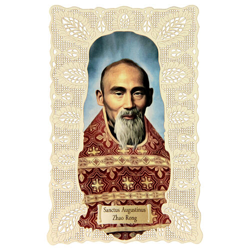 Dieses Heiligenbildchen mit Spitzendekor stellt den heiligen Augustinus Zhao Rong dar, einen chinesischen Priester und Märtyrer, der zur Gruppe der 120 heiligen Märtyrer von China gehört. Es ist auf hochwertigem Baumwollfaserpapier gedruckt und misst ca. 11 × 7 cm.