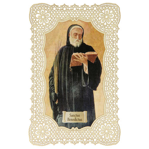 Der heilige Benedikt ist auf diesem Spitzenbildchen in einer fein ausgearbeiteten Darstellung zu sehen, eingefasst von einem filigranen Spitzendekor, der an die Andachtsbildchen vergangener Zeiten erinnert.