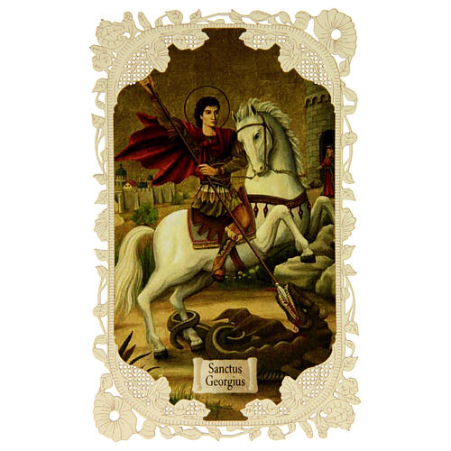 Dieses Heiligenbildchen mit Spitzendekor zeigt den heiligen Georg im ikonischen Kampf mit dem Drachen – ein Sinnbild für Mut, Glauben und den Sieg des Guten über das Böse.