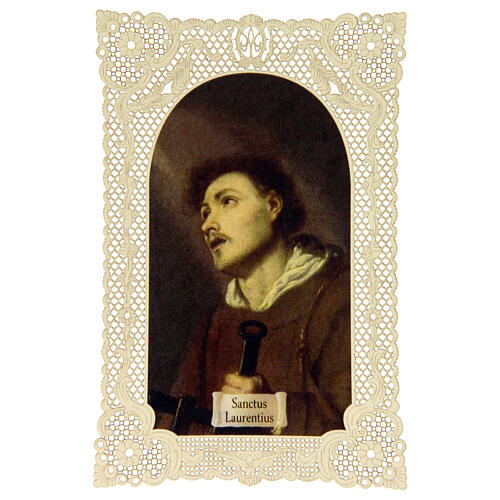 Spitzenbildchen, Heiliger Laurentius, Heiligenbildchen mit Spitzendekor, 11 x 7 cm