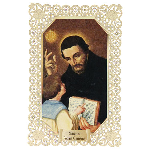 Dieses Heiligenbildchen mit Spitzendekor zeigt den heiligen Petrus Canisius, Jesuit, Kirchenlehrer und bedeutender Verteidiger des katholischen Glaubens während der Reformation. Es ist auf edlem Baumwollfaserpapier gedruckt und misst ca. 11 × 7 cm.