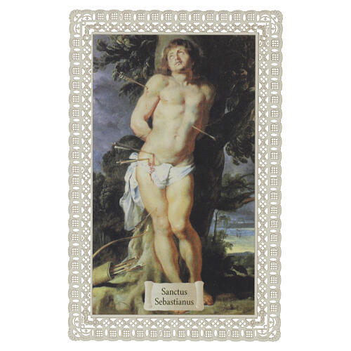 Spitzenbildchen, Heiliger Sebastian – Märtyrer mit Pfeilen, Heiligenbildchen mit Spitzendekor, 12 × 7 cm