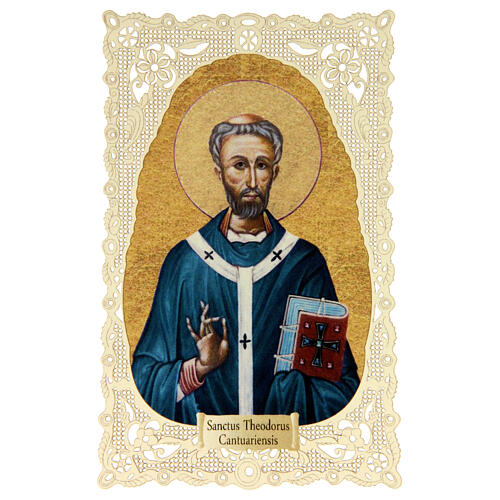 Dieses Heiligenbildchen zeigt den heiligen Theodor von Canterbury und ist auf edlem Baumwollfaserpapier im Format 11 x 7 cm gefertigt.