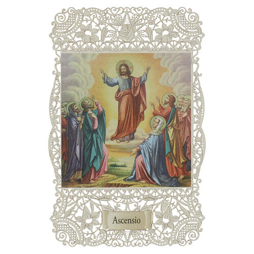 Spitzenbildchen, Himmelfahrt Christi, Heiligenbildchen mit Spitzendekor, 12 × 7 cm
