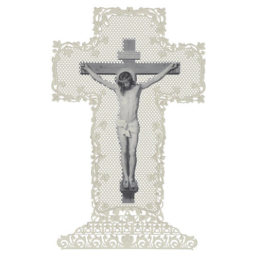 Spitzenbildchen aus Baumwollfaserpapier mit Darstellung des gekreuzigten Christus in zentraler Position. Die Figur Christi ist als silberfarbenes Relief ausgeführt und hebt sich plastisch vom Hintergrund ab.