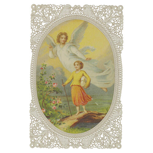 Spitzenbildchen aus Baumwollfaserpapier mit Darstellung eines Schutzengels, der ein Kind auf einem Weg durch eine Landschaft begleitet – ein Bildmotiv, das symbolisch auf den Schutz Gottes und das Sakrament der Taufe verweist.
