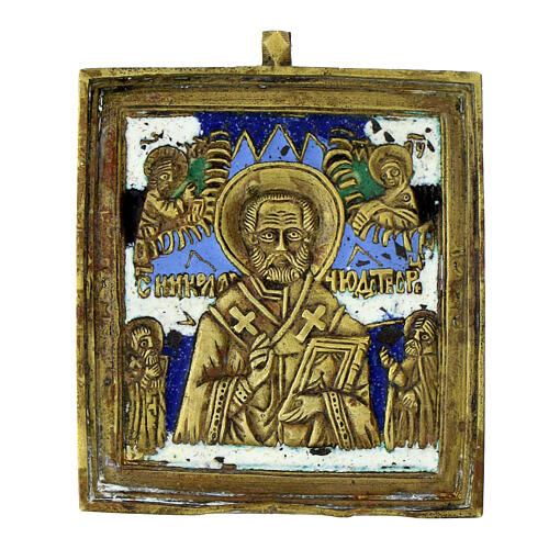 Alte Reiseikone – Heiliger Nikolaus, Bronze, Russland, 19 Jh, 5 × 3,5 cm