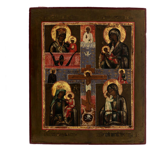 Diese seltene Ikone in quadripartiter Ausführung (Vierteilung) stammt aus dem 19. Jahrhundert und vereint vier symbolische Darstellungen der Gottesmutter sowie die zentrale Szene der Kreuzigung Christi. Jede der vier Marien-Ikonen ist tief verwurzelt in der russisch-orthodoxen Frömmigkeit und steht für Trost, Fürbitte und Mitleid.