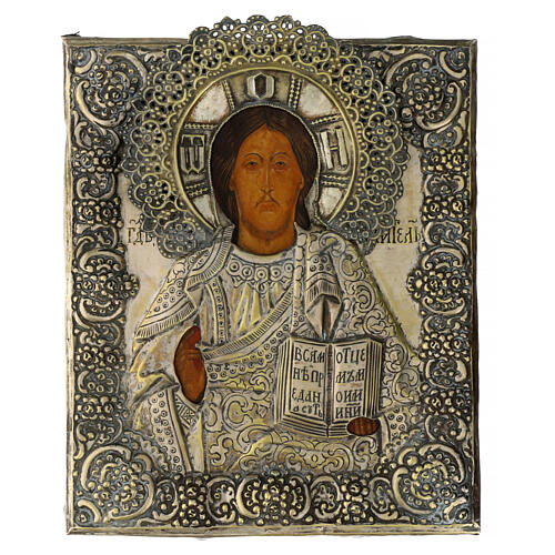 Antike russische Ikone, Christus Pantokrator mit Metallriza, neunzehntes Jahrhundert, 32 x 26 cm