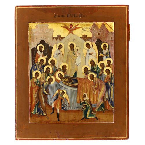 Antike russische Ikone, Entschlafung Mariens, achtzehntes Jahrhundert, 31 x 26 cm