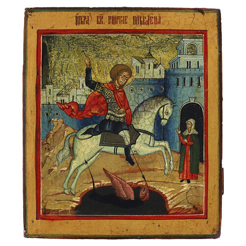 Antike russische Ikone mit der Darstellung des Heiligen Georg im Kampf mit dem Drachen.