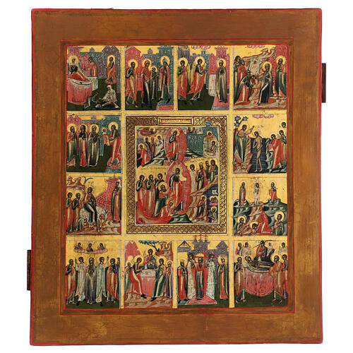 Antike Ikone aus der Stadt Moskau in Russland aus der Mitte des 19. Jahrhunderts. Diese traditionelle Ikone ist auf einem 35,3 x 30,5 cm großen Holzträger aus Linden gemalt und zeigt die zwölf großen Feste des byzantinischen liturgischen Jahres. Damit ist sie ein Artikel von ikonografischem und historischem Wert. Die zwölf Feste sind nach den alten Schriften nacheinander gegliedert und werden um das dreizehnte Fest oder die Mutter aller Feste, nämlich das Osterfest der Auferstehung, gelegt.Ostern wird hier mit einer Reihe von Interlaced-Szenen dargestellt, nämlich dem Abstieg in die Unterwelt Christi, der Prozession der Gesegneten in den Himmel, der Auferstehung Christi aus dem Grab und schließlich der Erscheinung am See von Tiberias.Die zwölf Feste, die aus Episoden des Alten und Neuen Testaments stammen, fungieren somit auch als biblische liturgische Katechese, immer unter dem Auge der Gläubigen.Dieses aufwändige Symbol wird mit einer blauen Samtbox, einem Echtheitszertifikat und einem Exportdokument geliefert.