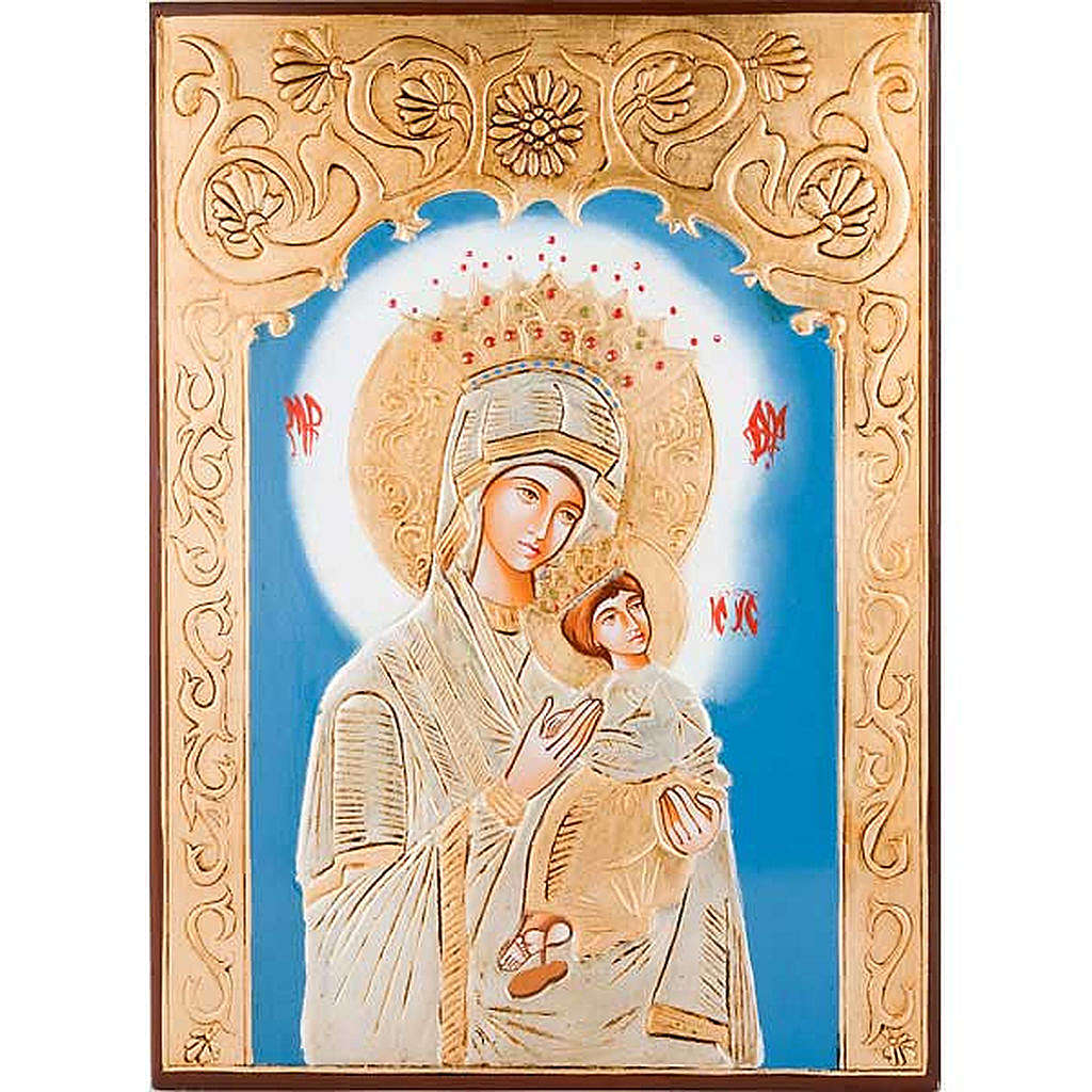 Ikone Gottesmutter der Passion. Die Ikone zeigt Maria und den Christking mit einer Krone in einer Umarmung. Das Bild ist in Relief in Rumänien Hand gemalt und mit einem goldenen Rand verfeinert.